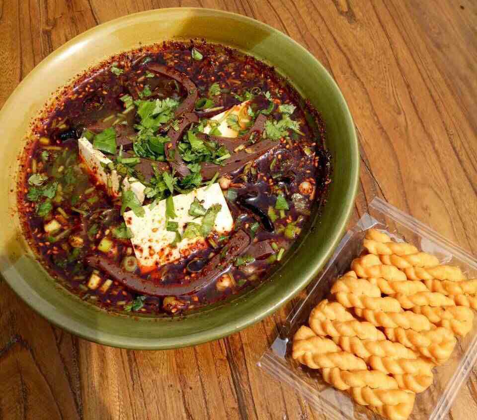 粉汤羊血是陕西地区汉族传统名小吃之一,由制血、配调料和泡馍三个步骤精制而成,食时配了粉丝、香菜等辅料。羊血鲜嫩、粉丝光滑筋软、辣香扑鼻、四季皆宜。调料多鲜,助人食欲,有助消化。